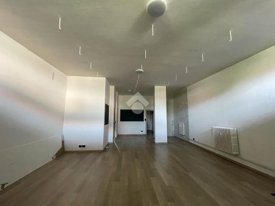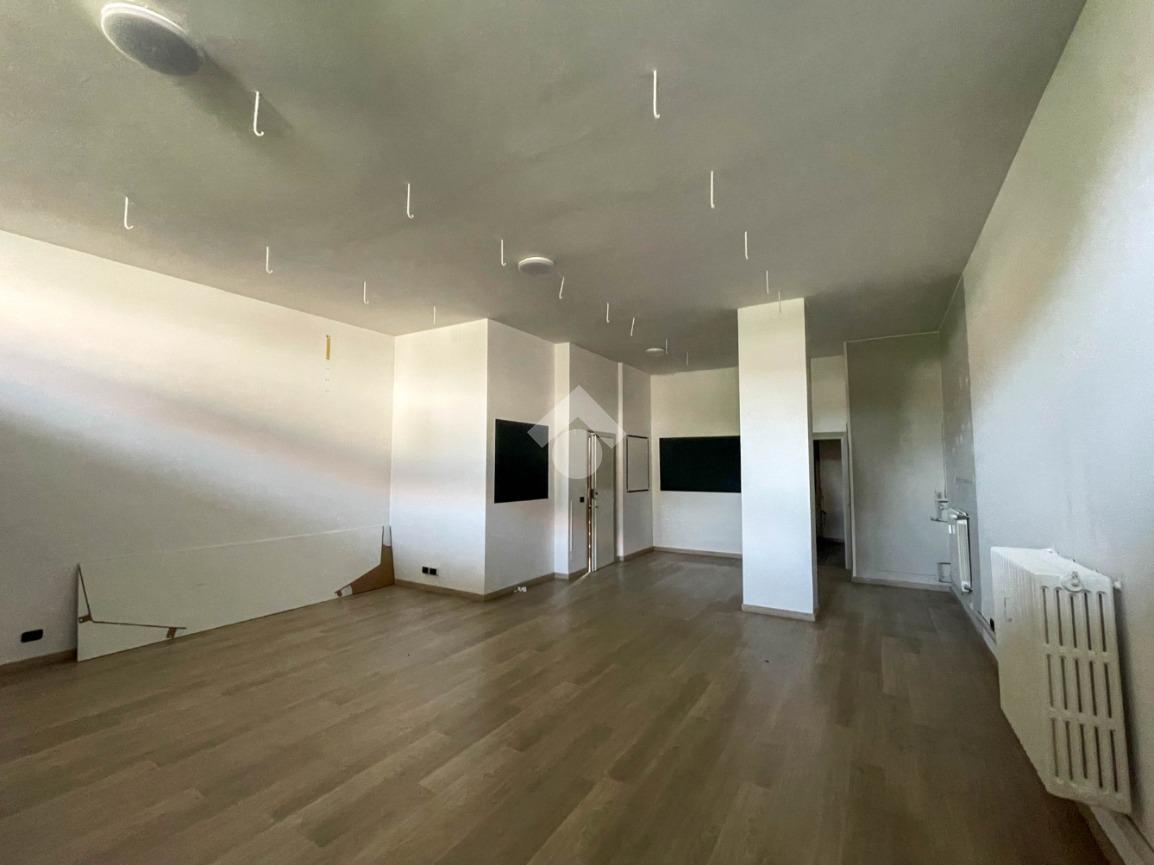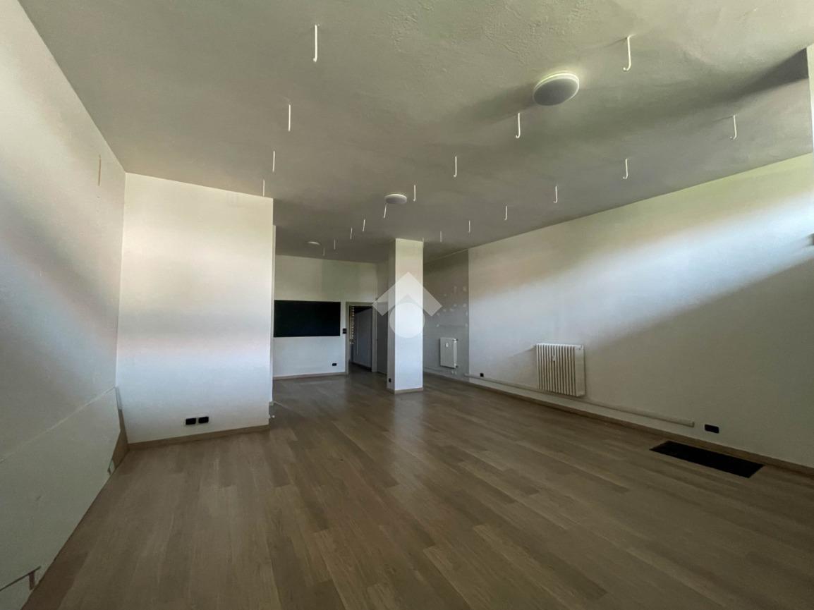 Ufficio di circa 75 metri quadrati in buone condizioniDisposto al piano terra (rialzato da due gradini) di una struttura condominialeUn servizio igienico (non a norma disabili)2 vetrine fronte strada protette da una saracinesca automaticaIMPIANTI E DOTAZIONI: Riscaldamento centralizzato a caloriferi, impianto elettrico e di illuminazione, impianto d’allarme